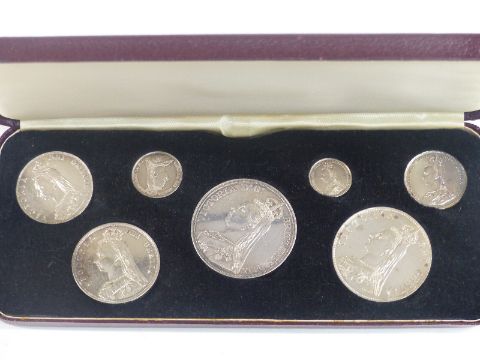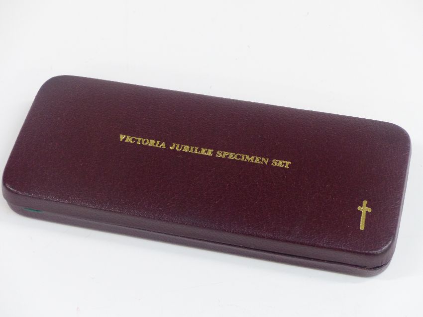 Victorian jubilee specimen set comprising seven coins from crown to threepence, in original case