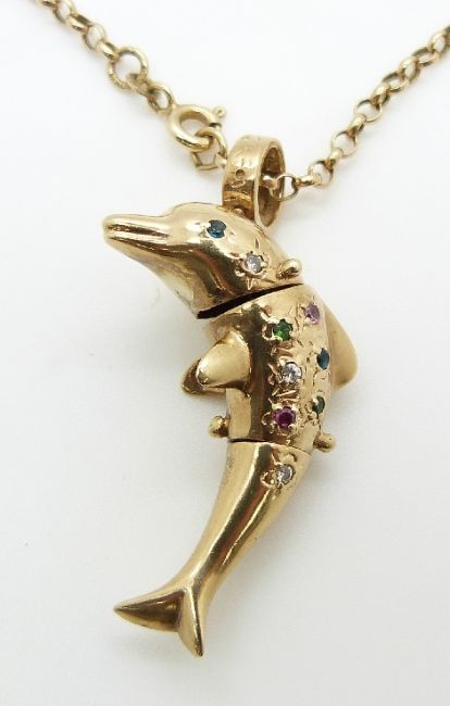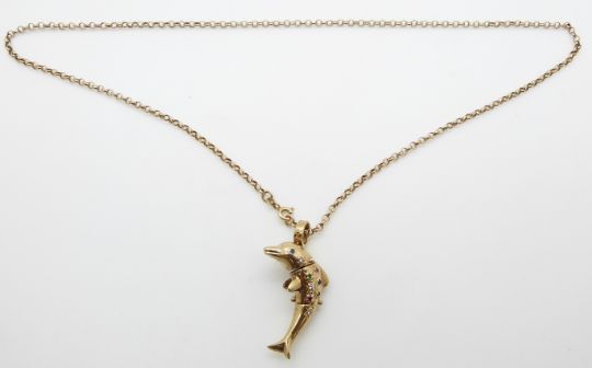 A 9ct gold articulated pendant in the form of a dolphin set with paste on 9ct gold chain, 7.83g