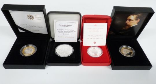 Four silver proof coins including 2012 £2 Charles Dickens, 2010 £2 Florence Nightingale, 2015 £5 Battle of Waterloo and an Australian 50c 2009 Year of the Ox, all cased with certificates