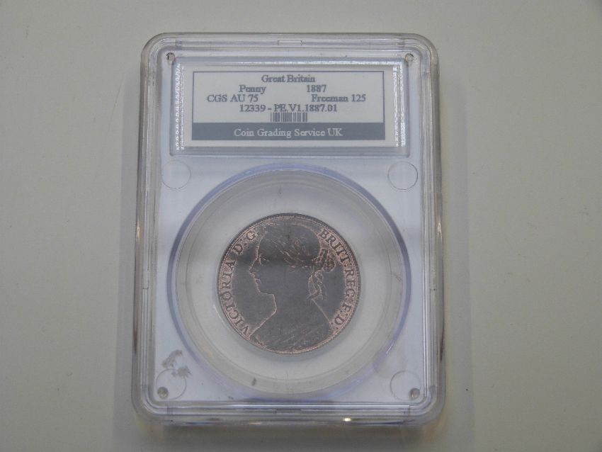 Victorian 1887 young head bronze penny CGS slabbed graded AU 75 Freeman 125