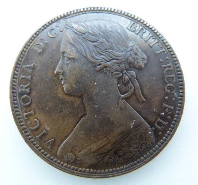 1860 Victorian bronze young head penny OT TB GVF, together with further example VF-EF, die crack flaws obverse, with lustre