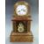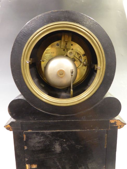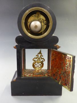 Nineteenth century mantel clock by Potonie Paris signed to dial and movement numbered 9239, the white enamel Roman dial, the trefoil hands, the ebonized drum case, with Boulle work decoration, visible pendulum through glass panel, 42cm tall