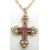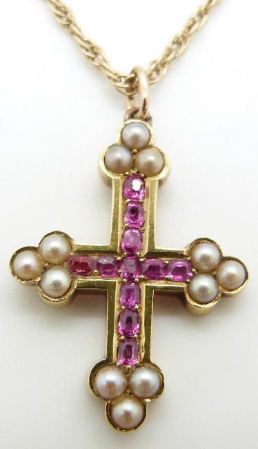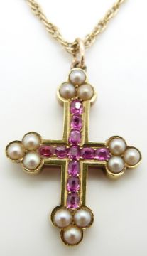 A yellow metal cross set with rubies and pearls and a 9ct gold chain, 10.2g