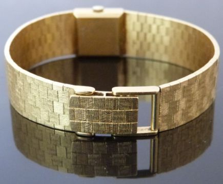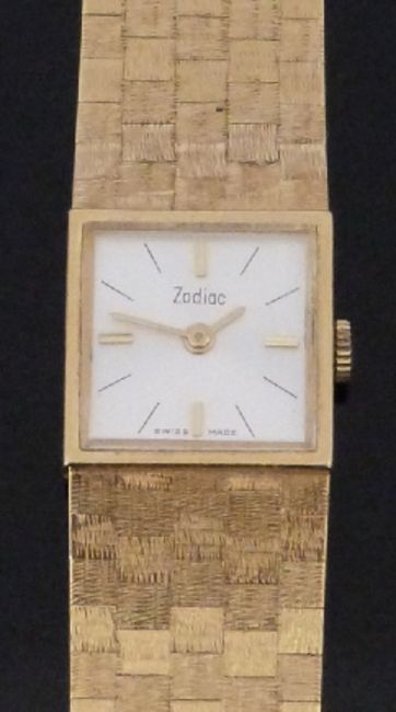 Zodiac 9ct gold ladies wristwatch ref. 105.297 with gold hands, gold and black baton markers, silver dial and signed 17 jewel movement, on integral 9ct gold bracelet, case diameter 16mm, serial number 538970, 42.8g.