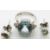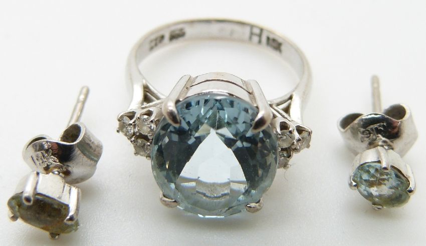 A 14k white gold ring set with an oval mixed cut aquamarine and three diamonds to each shoulder and a pair of matching earrings