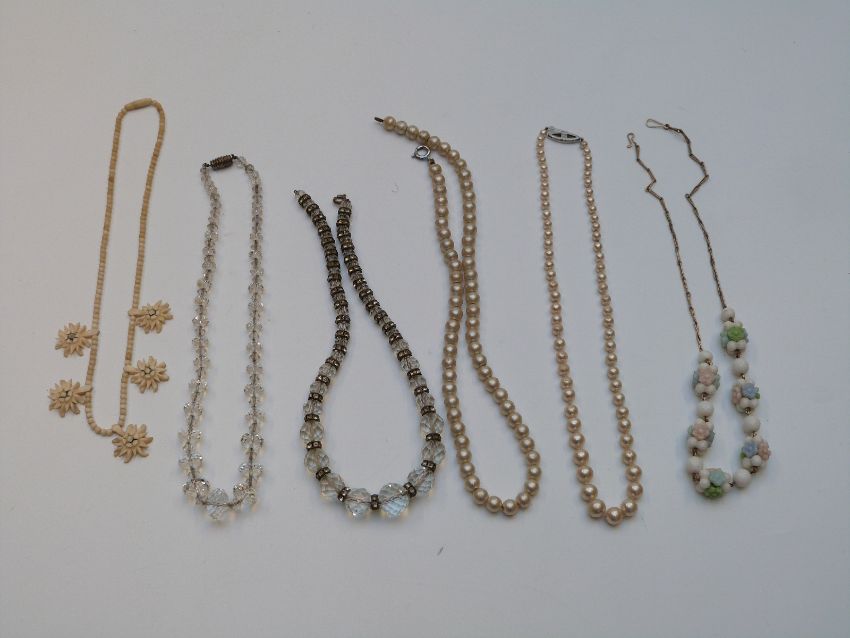 A collection of costume jewellery including glass necklace, Victorian brooch set with plaited hair, brooches, rolled gold bangle etc