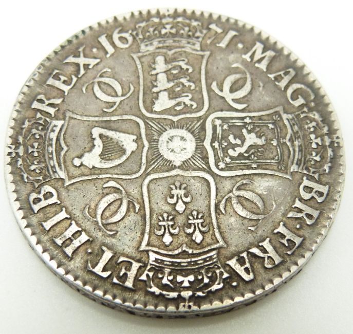 1671 Charles II crown, second bust V TERTIO edge, NVF