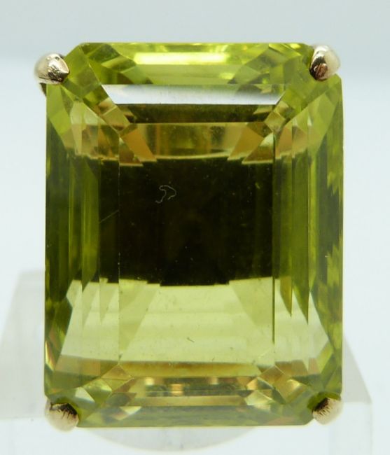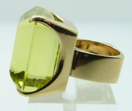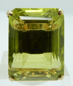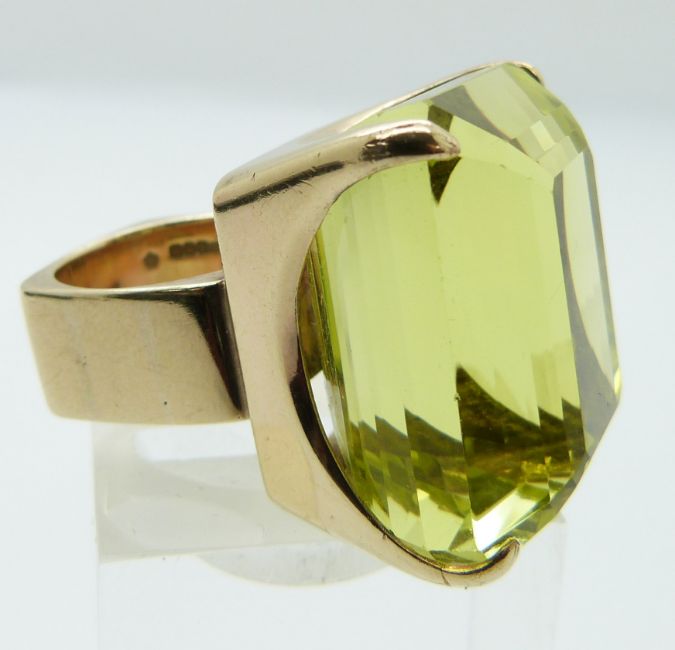 A 9ct gold ring set with a large emerald cut prasiolite, Sheffield 1975, maker J.S, size H
