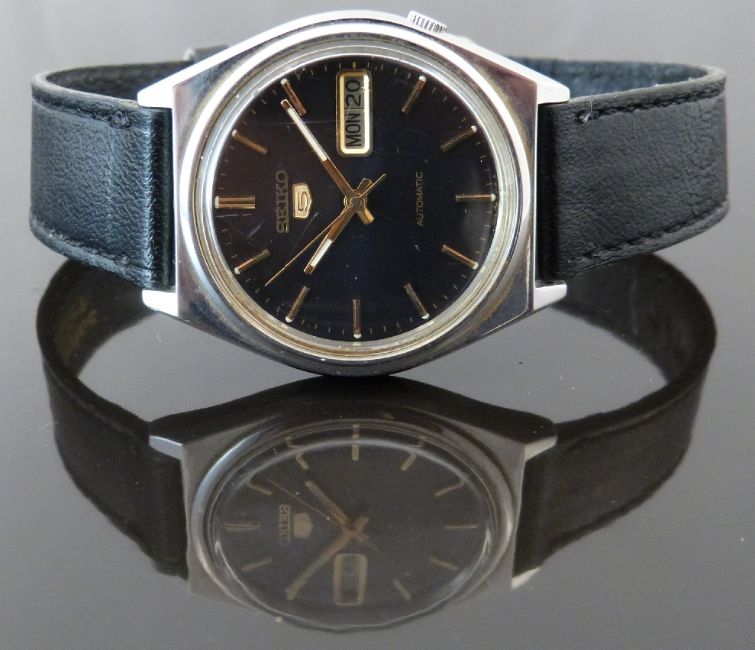 Seiko 5 gentleman’s automatic wristwatch ref. 7009-3140 with day and date aperture, luminous and gold hands and baton markers, black face, stainless steel case and signed 17 jewel calibre 7009A movement, on black leather strap, case diameter 36mm, serial number 004086, in original box with outer sleeve, guarantee and sales receipt