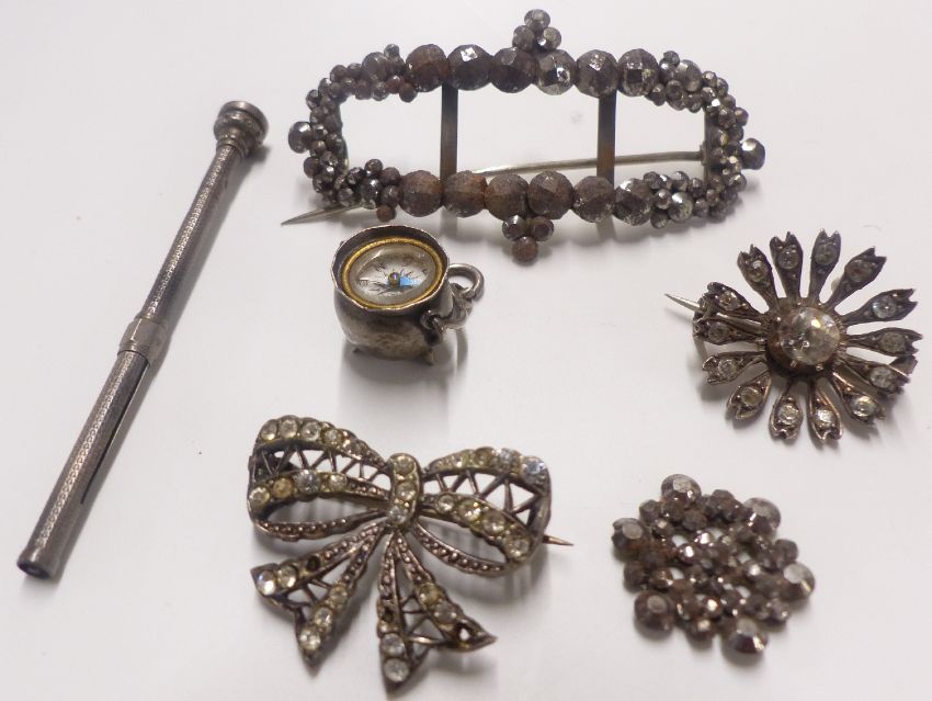 A collection of jewellery including cut steel, paste, silver ring, white metal fleur de lys bracelet. coins, white metal pencil, compass charm, gilt necklace etc