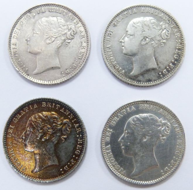 Four young head Victorian sixpences, three for 1868 and a further 1869 examples, die numbers 7, 12, 13, 15