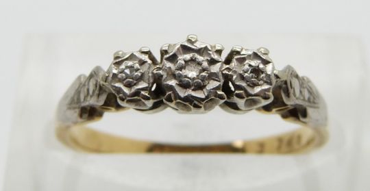 An 18ct gold ring set with three diamonds in a platinum setting, size M