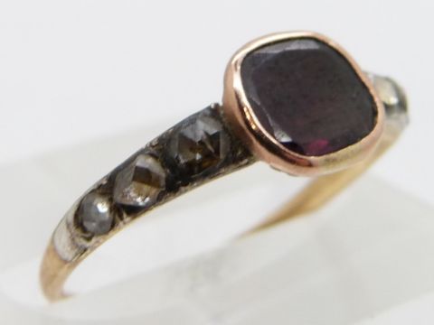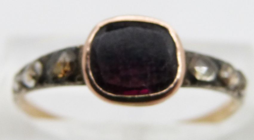 Georgian / Victorian ring set with a foiled garnet and three rose cut diamonds to each shoulder, with receipt, size L