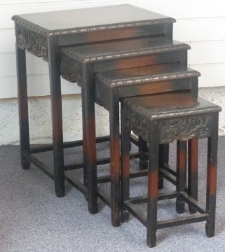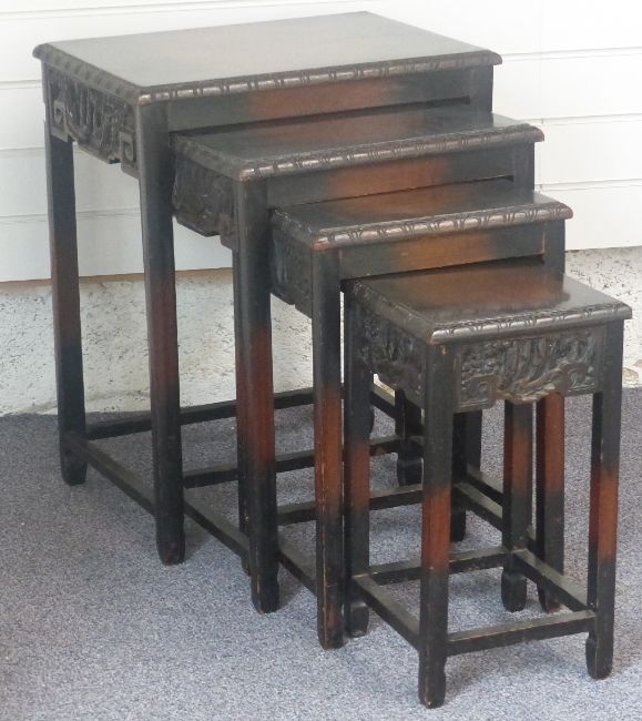 Chinese nest of four tables with carved friezes, W51 x D37 x H64cm