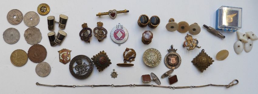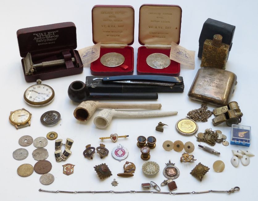 Hallmarked silver cigarette case, military badges, silver fobs, Guinness cufflink, military watch, pipes etc