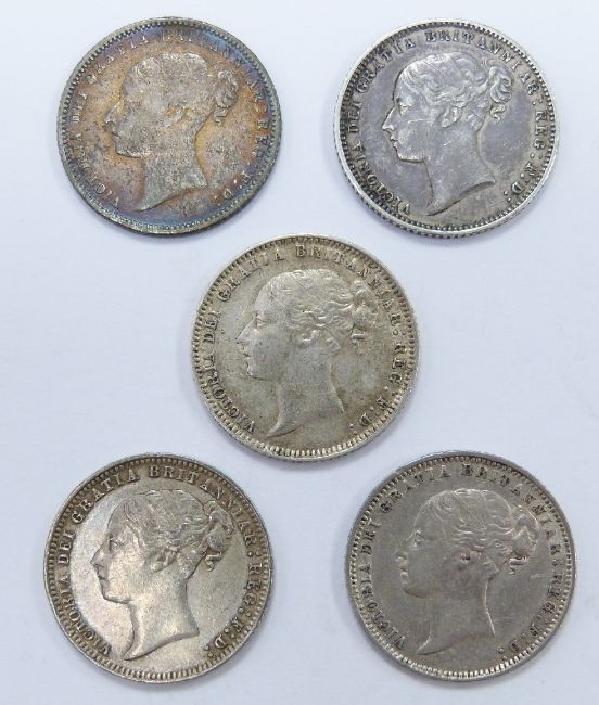 Five 1874 young head Victorian sixpences, die numbers 15, 27, 28, 33, 42, NVF