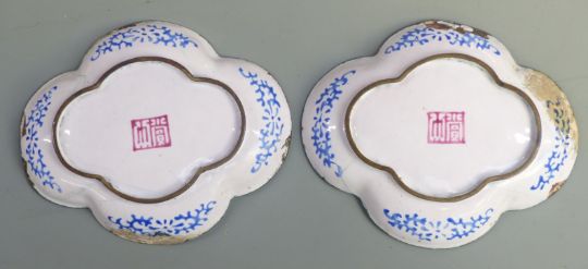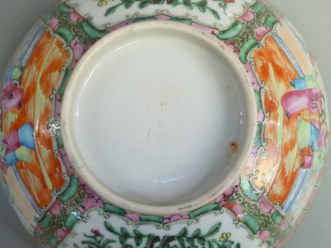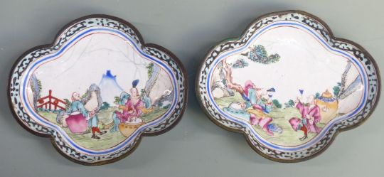 A pair of Chinese Cantonese famile rose plates together with a similar bowl, 25.5cm in diameter and a pair of Chinese enamel dishes