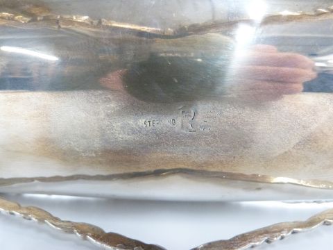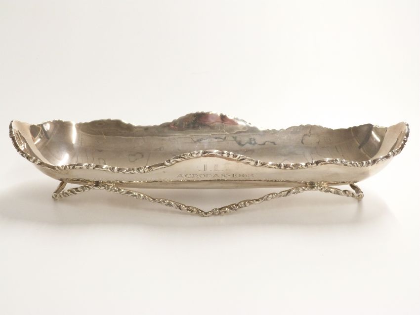 Mexican white metal long dish raised on cast bar stand, marks rubbed but sterling Mexico visible, length 35.5cm, weight 625g