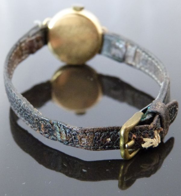 Rotherham & Sons 18ct gold ladies wristwatch with blued Breguet hands, black Arabic numerals, engraved gold face, bevelled bezel and signed 15 jewel movement, on black leather strap, case diameter 22mm, serial number 2472.