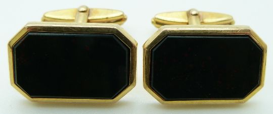 A pair of 9ct gold cufflinks set with bloodstone, 3.6g