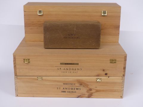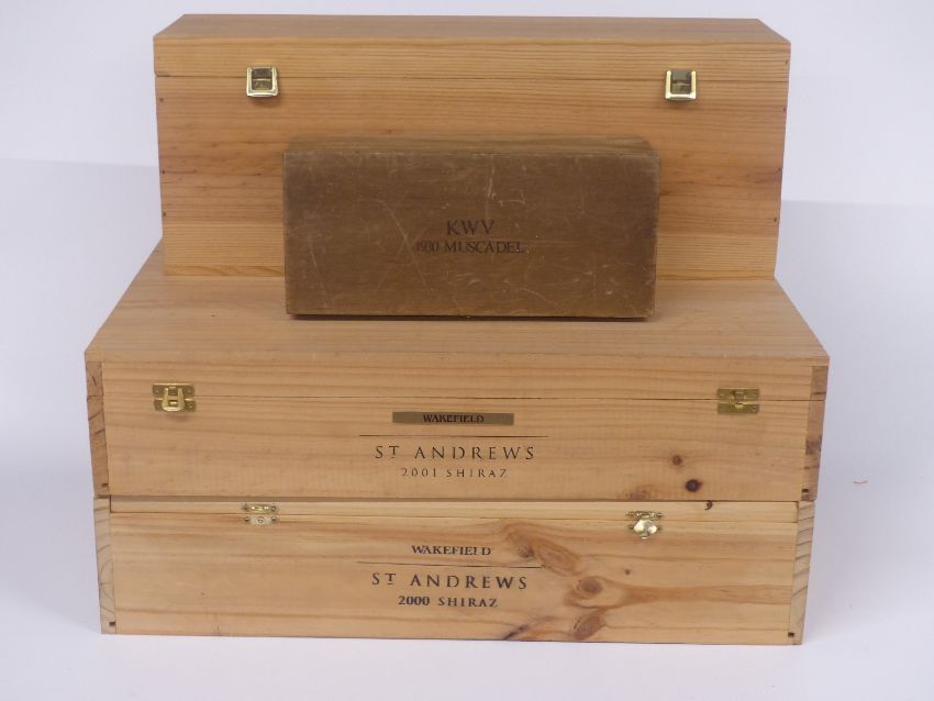 Four vintage wooden wine boxes/cases including 1930 Muscadel box, Wakefield St Andrews 2001 and 2000 Shiraz cases