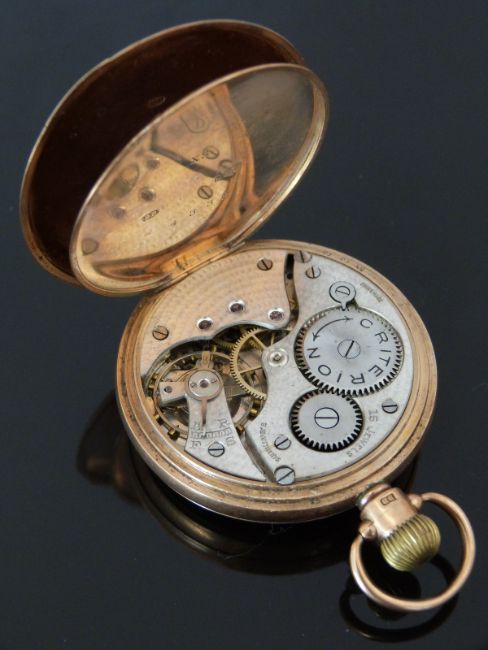 Criterion 9ct gold keyless winding open faced pocket watch with inset subsidiary seconds dial, black Roman numerals, blued hands, white enamel face and signed 15 jewel movement, case diameter 48mm, serial number 4332, 77.1g.