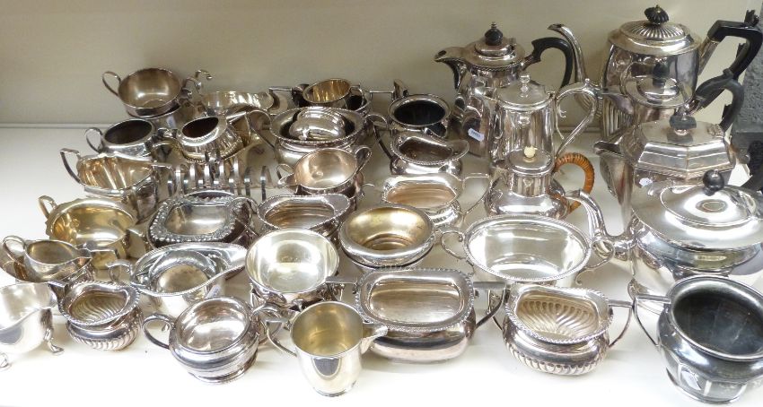 A quantity of silver plated ware including toast racks, wine coaster, bowls, sauce boats, teaware etc
