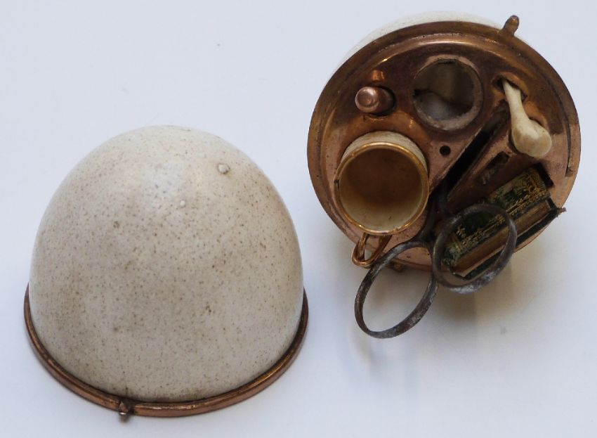A 19thC etui case, the egg shell case opening to reveal a fitted gilt interior set with ivory thimble and accessories, 6.5cm tall