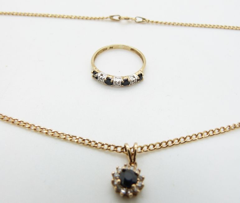 A 9ct gold necklace set with a sapphire and diamonds and a 9ct gold ring set with diamonds and sapphires