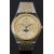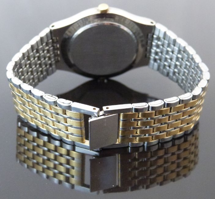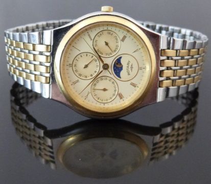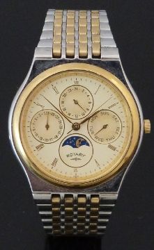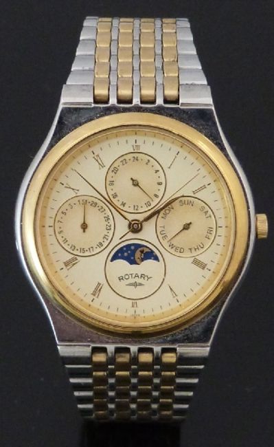 Rotary triple calendar gentleman's wristwatch with inset day and date dials, moonphase, gold Roman numerals, gold bezel, stainless steel case and quartz movement, on bi-metal bracelet, case diameter 34mm, serial number 3577.