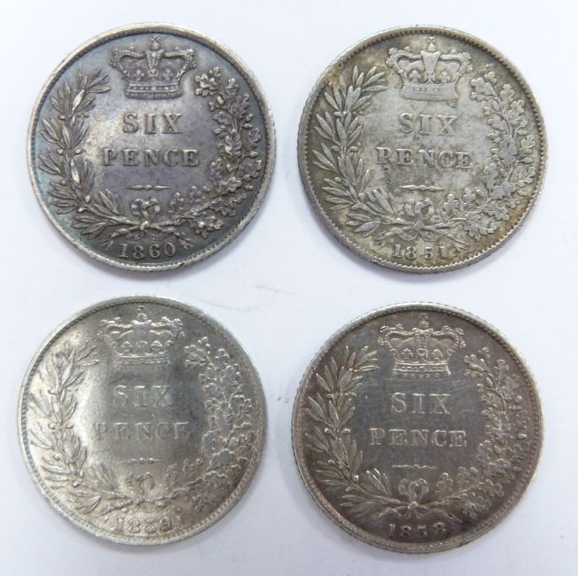Four Victorian young head sixpences, F-NVF, 1851,1858, 1859 and 1860