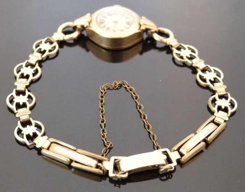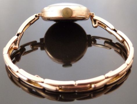 Two 9ct gold ladies wristwatches one Edwardian with blued hands, black Arabic numerals and sunburst dial, on 9ct gold expanding bracelet, 21.1g, the other Rotary with gold hand and Arabic numerals and champagne face, on 12ct rolled gold bracelet.