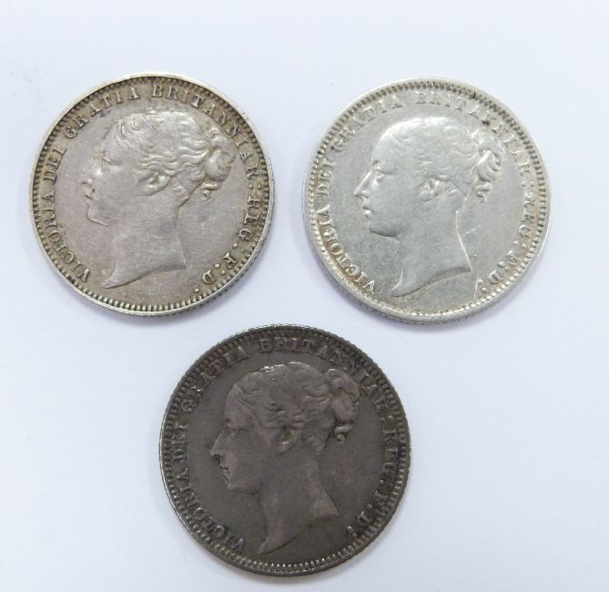 Three young head Victorian sixpences for 1875, one with 1874 obverse type 3-Davies 1085, possible mule (obverse 4 introduced 1874) F-VF, die number 74, one NEF, die number 69, the other VF, die 15