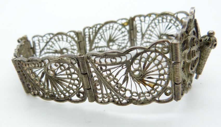 A hallmarked silver bangle, 29 Sudanese white metal bangles and a filigree bracelet