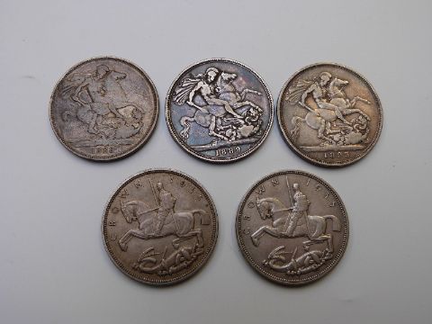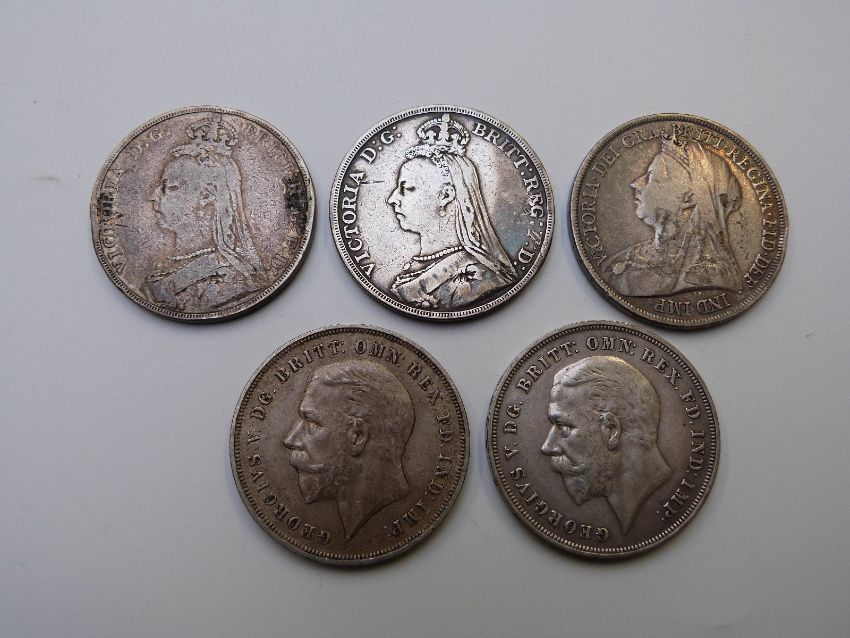 Five English crowns comprising 1888 and 1889 Victorian Jubilee, 1893 veiled head example and two 1935 George V 'rocking horse' crowns