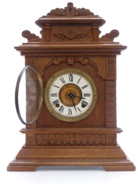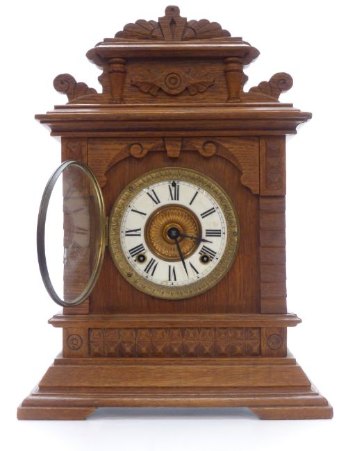 Ansonia oak table/mantel clock in carved case, Roman dial, Beetle and Poker hands, striking on a gong, 45cm tall