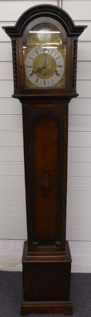Mid 20thC oak cased longcase grandmother clock, the Roman silvered chapter ring signed H Vaughan, Cinderford, the brass dial with masked spandrels, three train eight day movement with Westminster chime, the arch top hood with barley twist decoration, 170cm tall