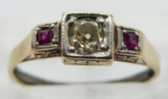 Art Deco ring set with an old cut diamond of approximately 0.3ct and two rubies, size K