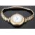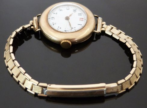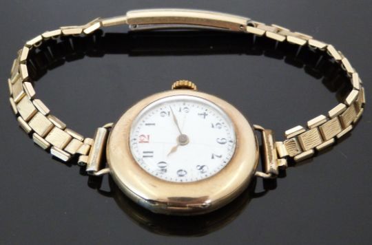 Swiss 9ct gold ladies wristwatch with Arabic numerals, gold hands, white enamel face and 15 jewel calibre 1187 movement, on gold plated bracelet, case diameter 29mm, serial number 2846331