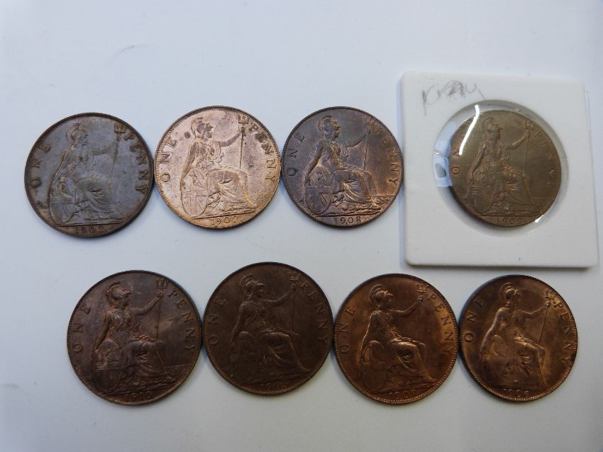 Eight Edward VII pennies, EF+, various dates 1902 -1910
