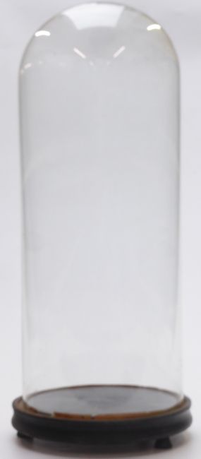 A circular glass dome on stand, approximate diameter 21cm