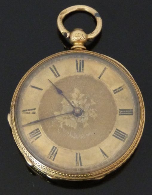An 18ct gold open faced pocket watch with black Roman numerals, blued hands, engraved self-coloured face, engraved case and unsigned movement, case diameter 36.5mm, serial number 12909, 35.3g.