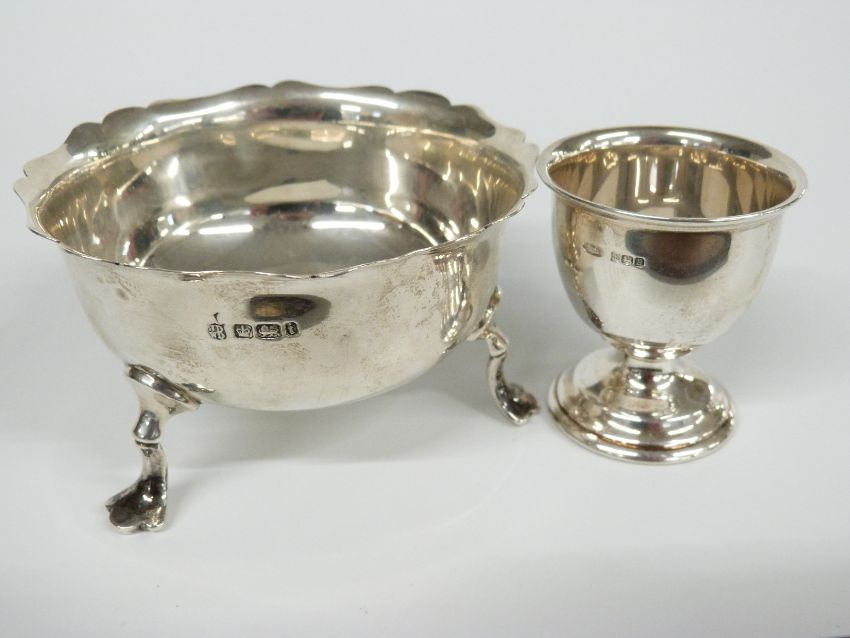 A quantity of hallmarked silver items including sugar bowl, tea strainer, egg cups, sugar tongs etc and a pin dish decorated with dragons and marked sterling, weight 290g, Respect razor and a folding ruler