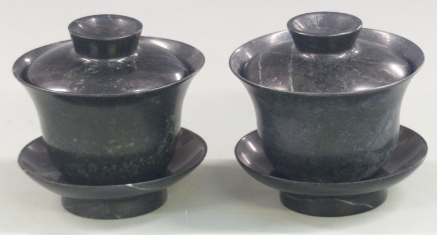 A pair of Chinese carved / turned hardstone cups, underplates and covers, with boxes, height 9.5cm