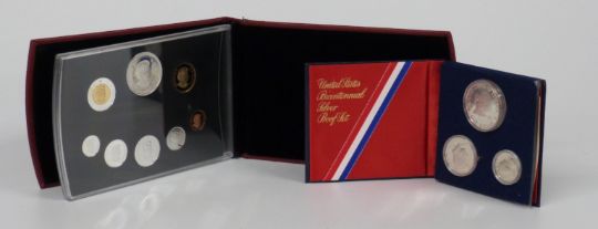 Two silver proof coin sets comprising 1976 USA Bicentennial Dollar, half and quarter together with a Royal Canadian Mint set