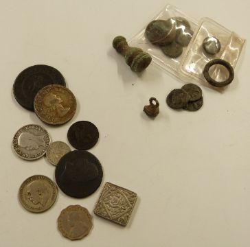 An interesting collection of coins, tokens, Roman artefacts and a WWII War Medal etc., some silver content