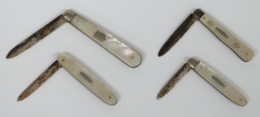 Four Victorian and later hallmarked silver and mother of pearl fruit or pocket knives comprising Sheffield 1897, 1893, 1918 and Birmingham 1871