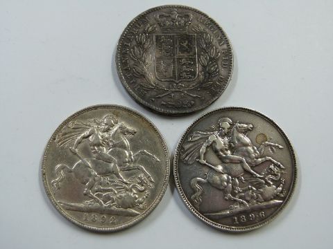 A trio of Victorian crowns comprising young head 1845 VIII with cinquefoils, 1896 LX veiled head and 1892 Jubilee example