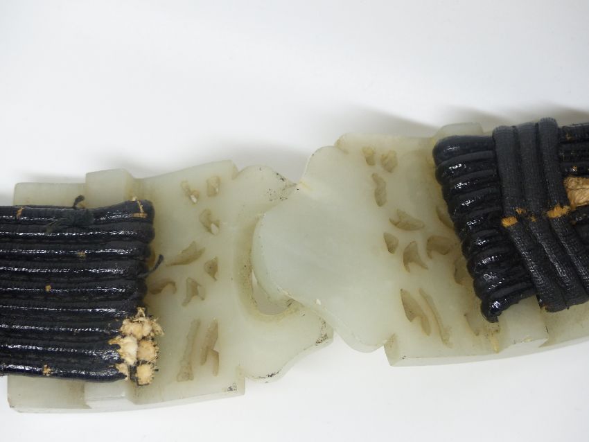A 19th Century Chinese pierced and carved jade belt buckle in two parts, on later belt, 4.5 x 11 cm.