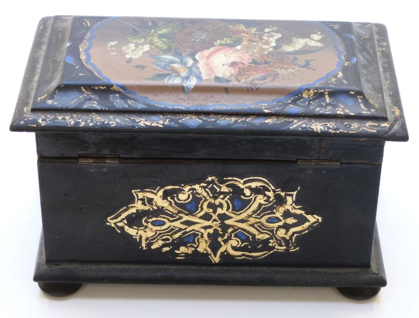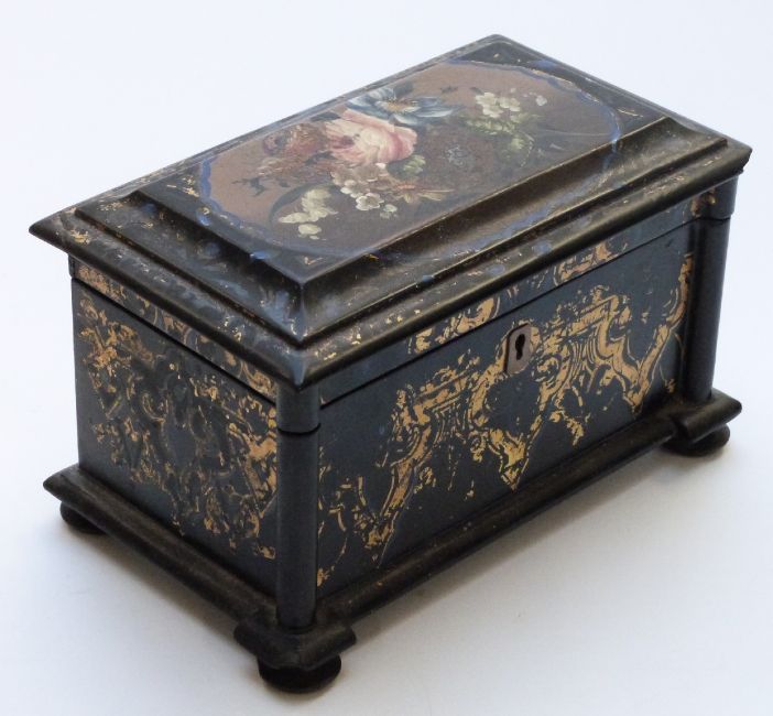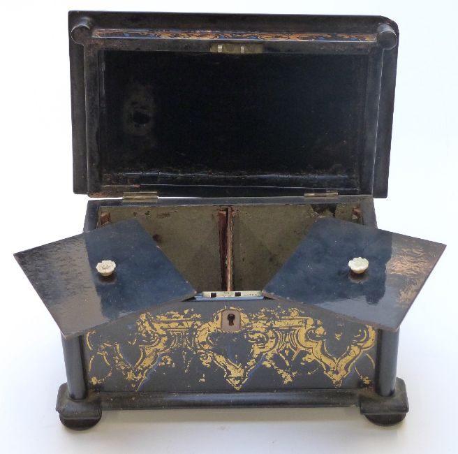 Jennens and Bettridge 19thC papier maché two division tea caddy with VR cipher to lock, H 12cm x  W x 20cm x D x 12cm
